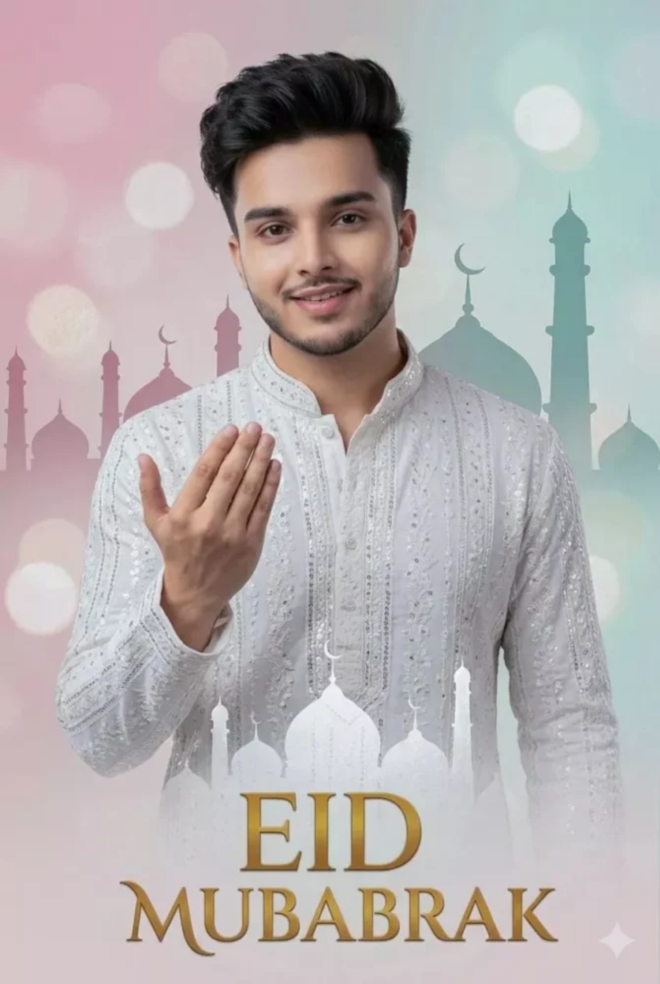 Prompt: indian male celebrity style portrait. white kurta sequin, religious islamic silhouettes with pink background, soft smile, one hand gesture inviting/blessing pose, festive mood, clean studio lighting, elegant composition, ramadan/eid theme, subtle gradient green background, minimal shadows, high detail, realistic skin texture, Eid Mubarak text in elegant gold typography at bottom placement at top right, commercial ad style, centered framing, modern poster design –ar 2:3 –v 6 –sty