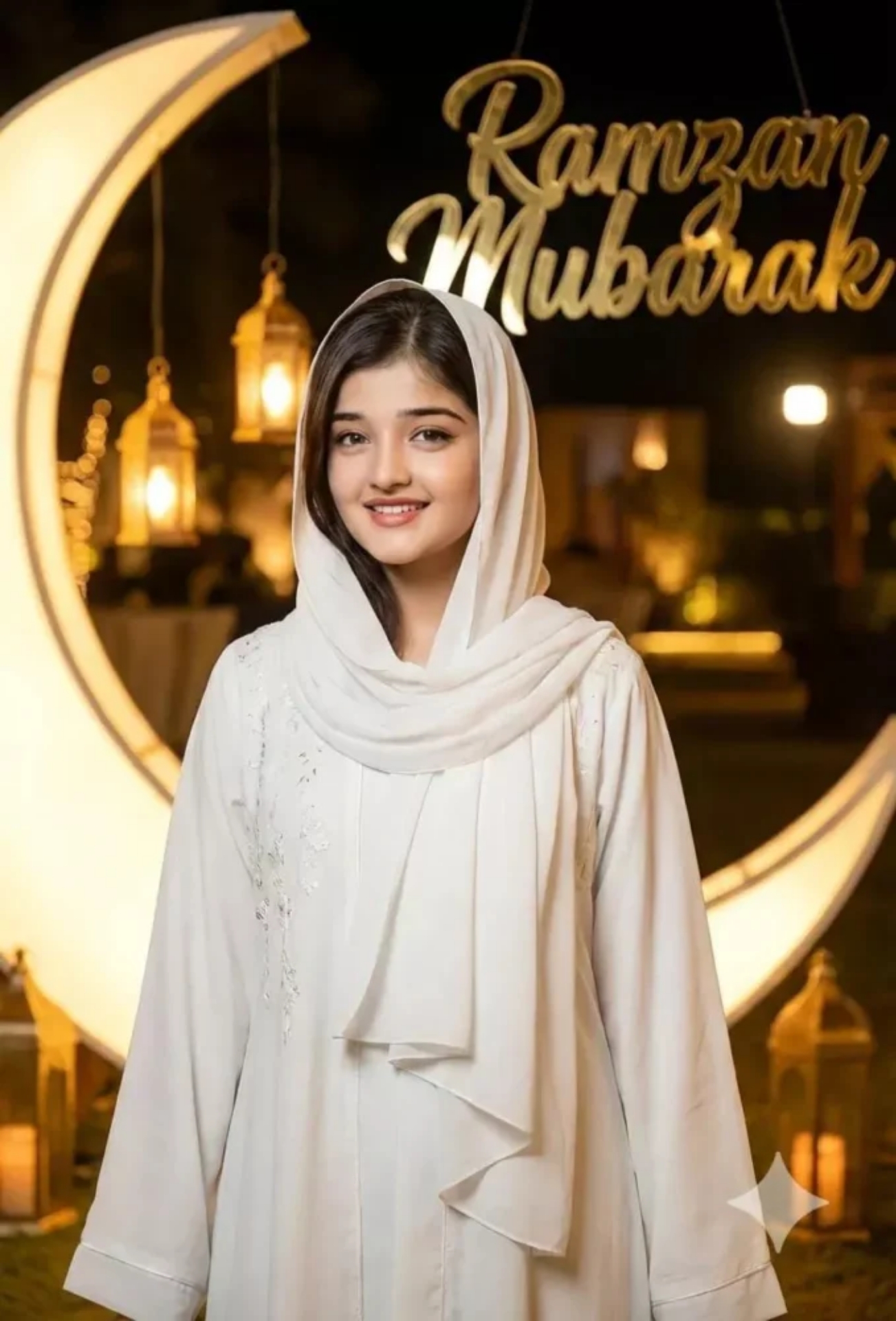 Ultra-realistic 8K photoreal image of the reference image of stylish young Indian woman standing confidently during Ramadan night. Wearing a modern fitted white abaya with subtle embroidery and soft fabric flow. Light glamorous makeup, sharp facial features, confident expression. Long straight black hair partially covered with a stylish hijab drape.