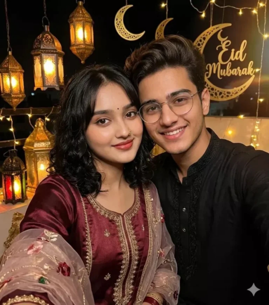 Generate a 45° degree angle close face couple selfie keeping 100% exact original facial identity from the uploaded images. A young Muslim couple taking a cozy Eid Mubarak selfie together at night. The woman has shoulder-length soft curly black hair with simple middle part bangs giving a sweet and stylish impression. Her makeup is glossy with nude red lipstick and light brown eyes. She is wearing a deep maroon satin Shalwar-kameez with elegant embroidery and a sheer organza dupatta with floral details, wearing a nose ring. The man beside her is wearing a stylish black kurta with subtle embroidery. Background filled with glowing Eid lanterns, fairy lights and golden crescent moon decorations with “Eid Mubarak” signage. Soft cinematic night lighting, blurred background, realistic smartphone portrait selfie quality.