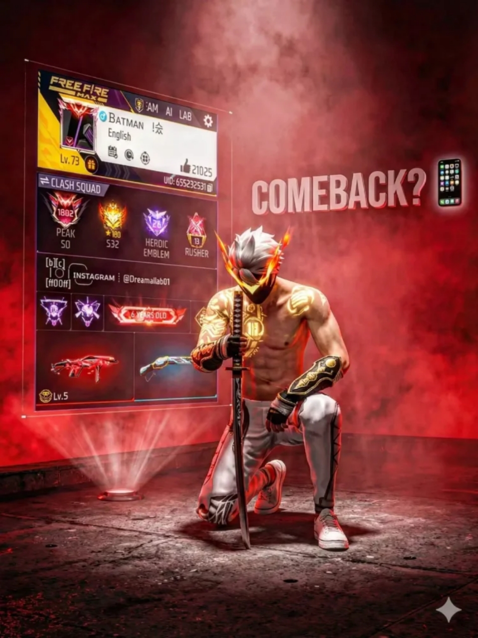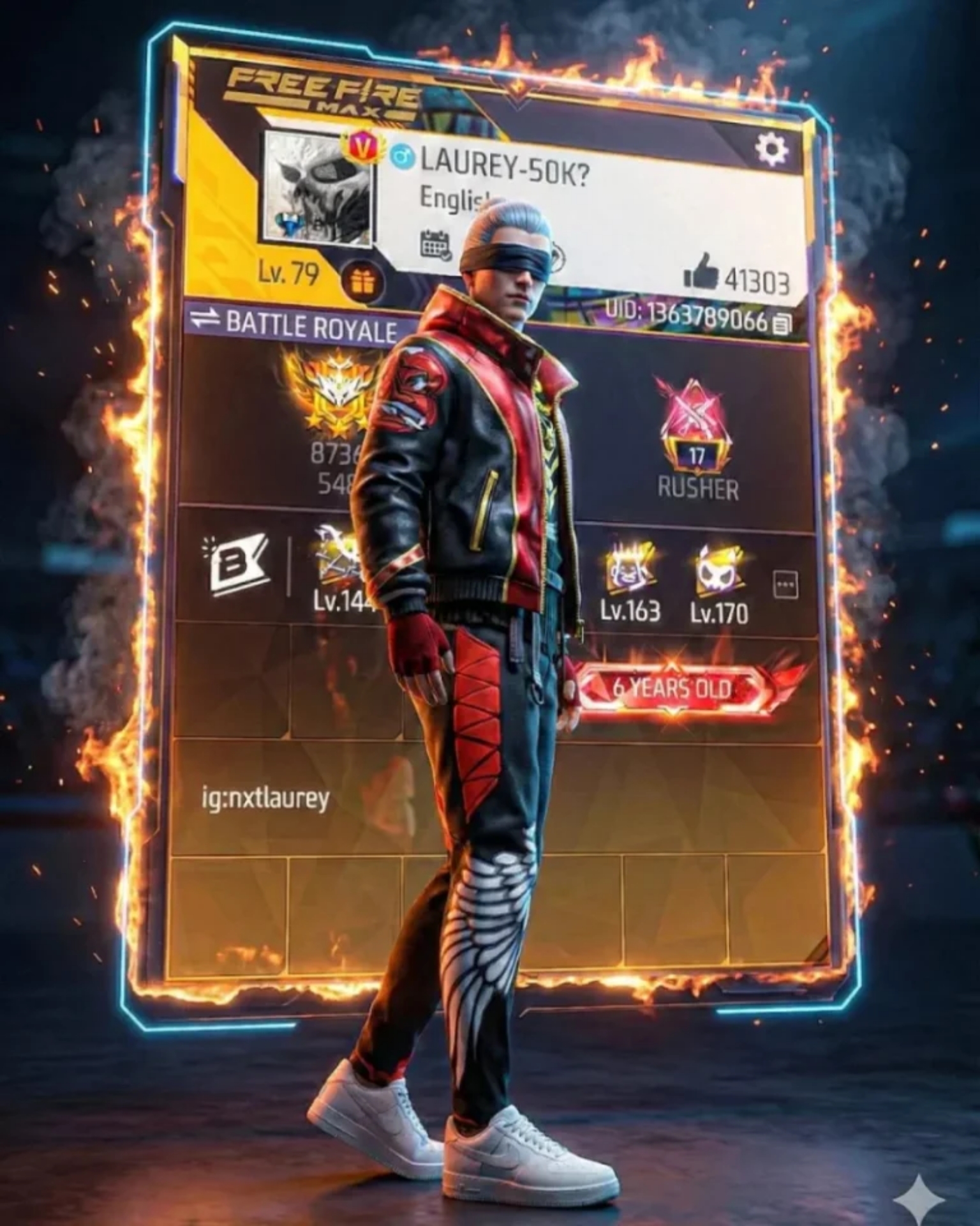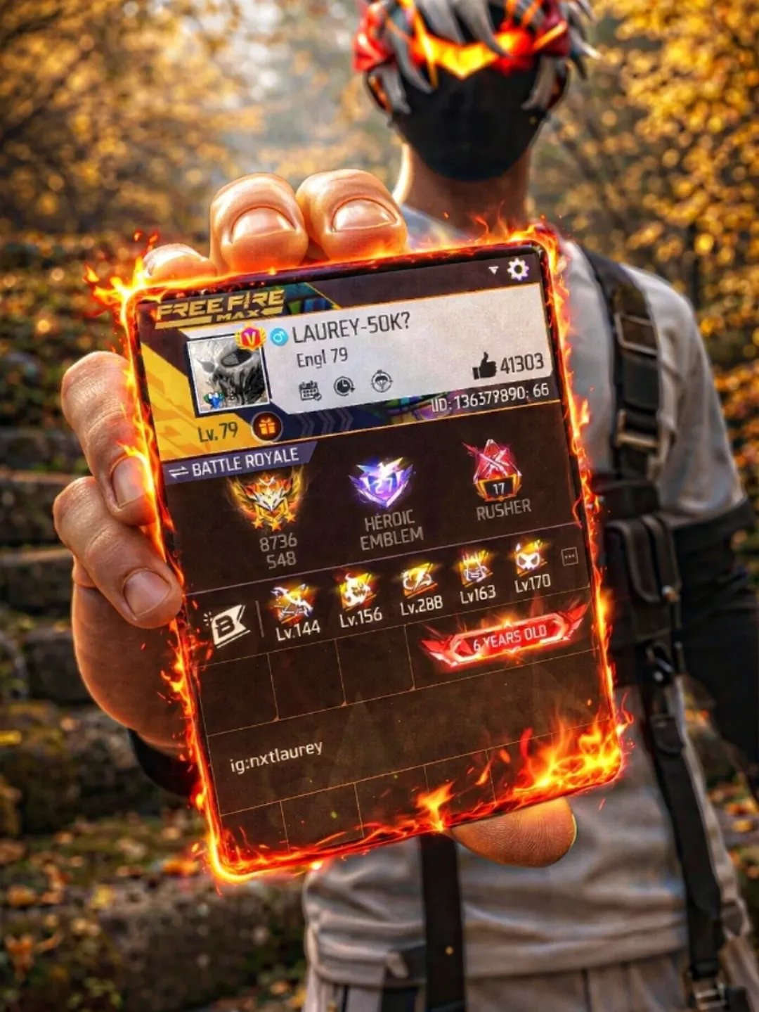 A realistic, high-quality close-up photo of a character wearing a custom dress as uploaded. The character holding a floatingi, virtual card in their hand using their thumb and fingers. The card displays a detailed free fire rofile interface with the username. The background is a soft, blurry depth-of-field effect, keeping the focus sharp on the Instagram card and the hand & card edge is glowing in red flame. 8k ultra realistic, 3D card. background of mossy stone steps and autumn trees, sunlight filtering through leaves, Unreal Engine 5 render style, 8k resolution, cinematic curve background, leafs are glowing, lighting, sharp focus, vertical aspect ratio –ar 9:16 –v 6.0. in the ratio of 1:1