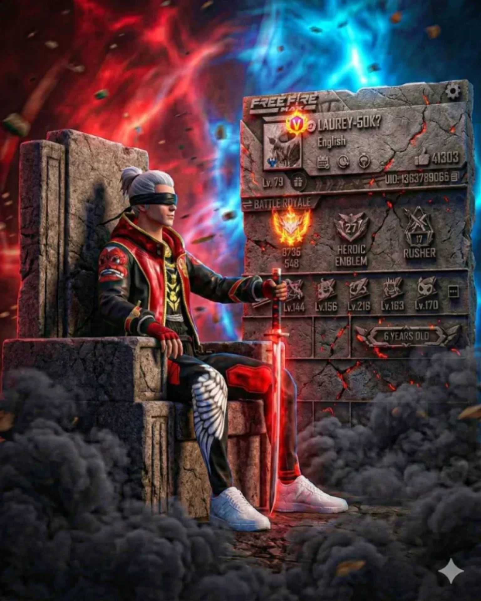 Ultra-realistic cinematic portrait ofa gaming character side viewside look, (same face as reference) siting firmly on a grand, stone chair, one hand resting on the hilt of a glowing sword placedvertically with an camera angles, His posture back straîght, vlewer. The background has a mix of red andelectric blue lighting, with floating dust andmotion suggesting chaos, Styles afnematieprofile and saratch and like stone type of profile and a visiblepower shot, 8K detail, dark contrast, dramaticTools and also smoke in the ground dark smoke andlighting, His dress unchanged from reference image and besidethe character add Gaming profile with 3d style and fire on thewith high quality, in the ratio 3.4