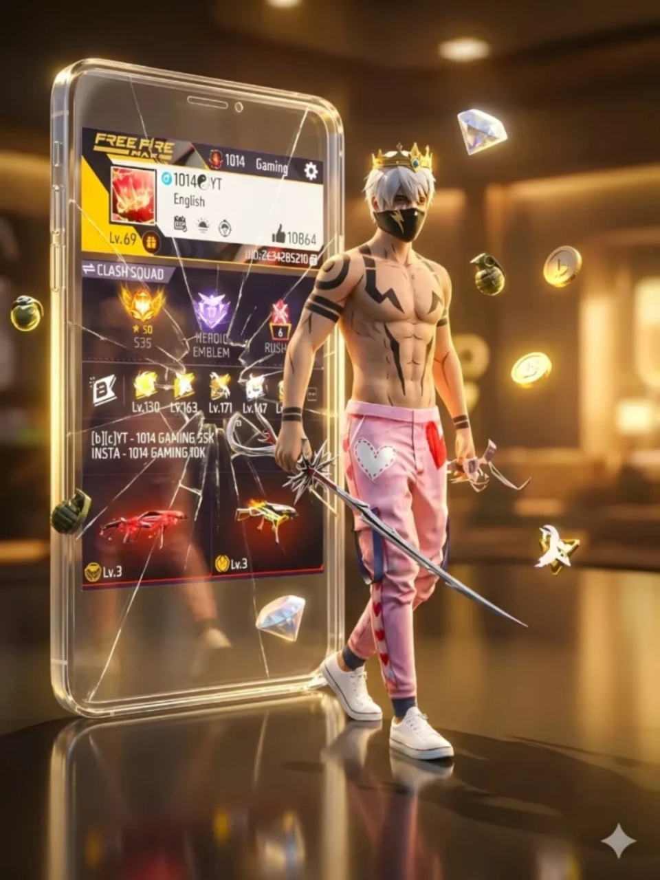 A hyper-realistic 3D cinematic render of a cool, stylish young male video game character walking forward, stepping out of a giant, glowing, transparent glass smartphone screen. The character wears a same dress as uploaded. The giant glass screen behind him left side 3d style is a cracked and displays an Free fire max profile interface,. Floating in the air around the character and the screen are glowing 3D, The setting has a dark, reflective floor with warm, golden, cinematic lighting in the background. 16k resolution, highly detailed, photorealistic in the ratio 3.4