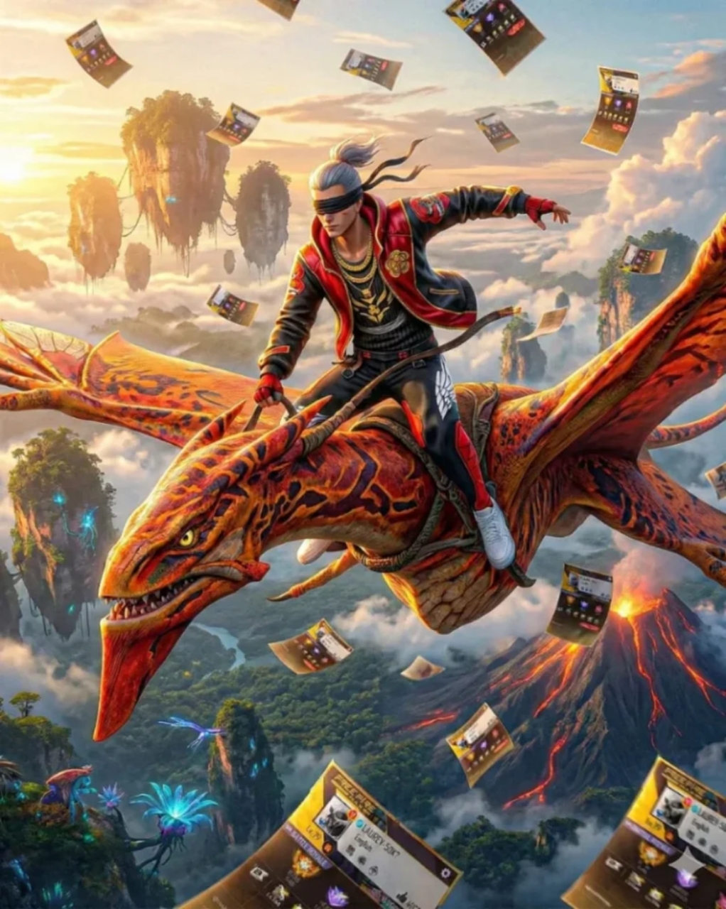 Ultra-high-resolution cinematic fantasy shot inspired by the world ofPandora (Avatar), a powerful Toruk flying at extreme altitude above thefloating landscapes and volcanic regions of Pandora, wide aerialperspective with dramatic depth, vast sky and clouds, glowing mourmountains, lava-touched terrain and bioluminescent environment visiblebelow, strong sense of height, speed and motion.NEW POSE;Place ME riding the Toruk in a FORWARD-LEANING COMMANDING POSE, upper body slightly leaned forward with confidence, both hands grippingthe reins frmly, Iegs Iocked and stable on the Toruk’s back, strongheroic posture suggesting control and dominance, wind powerfullyflowing through clothes, cinematic sense of motion and scaleCharacter appearancenA character rider with a wears a same dress as uploaded, contrastagainst,3.4From above, countless sheets of paper are falling through the air, captured,Each paper has a clearly visible, high-resolution textureshowing the uploadedimage, fully readable and sharp. The profile must appear unchanged and distinctly recognizable on every sheet.Lighting should be dramatic and cinematic — golden hour orsoft overcast direct create image