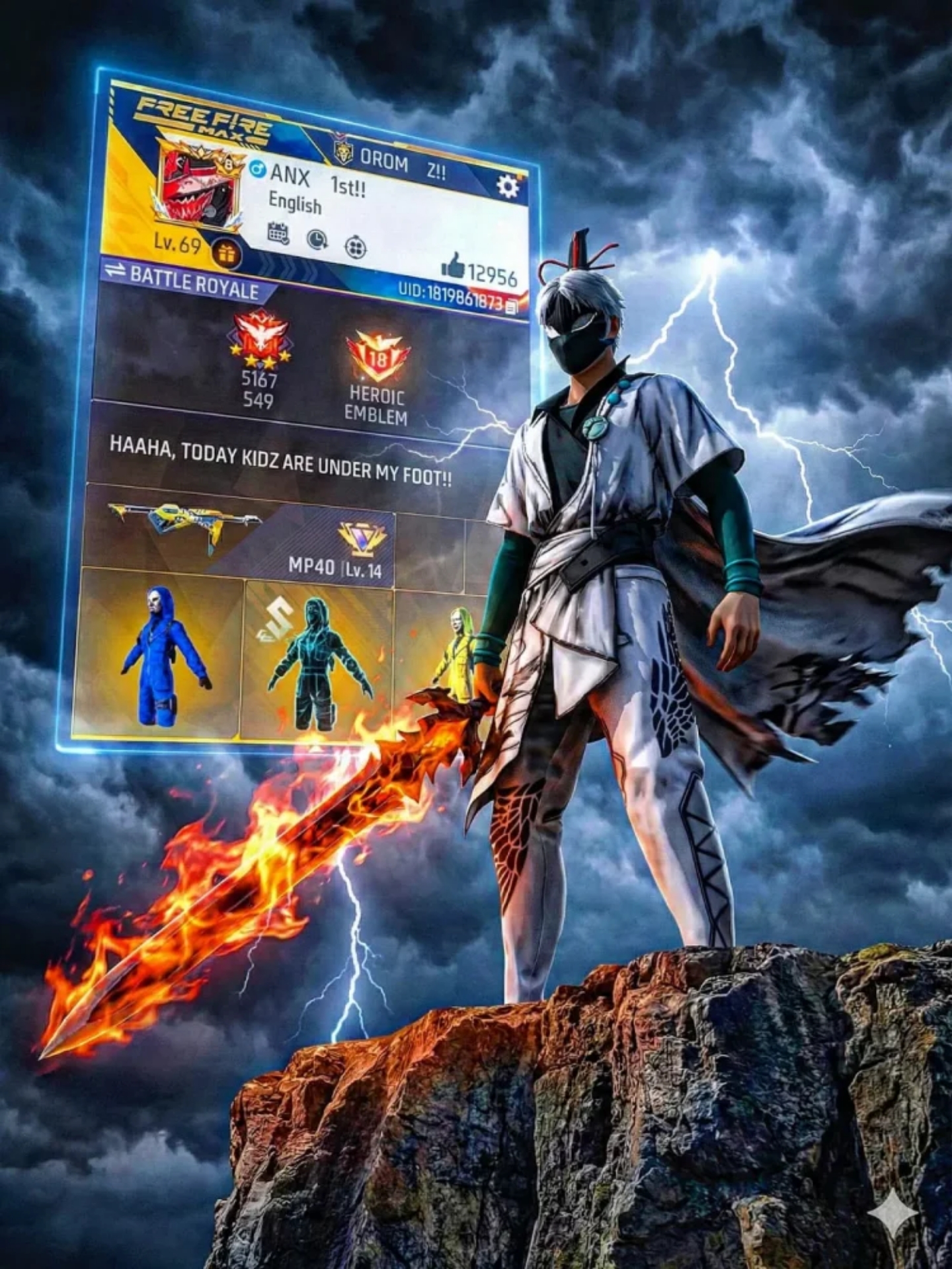 “Epic adventure warrior standing on the edge of a cliff above clouds. Wind blowing cape dramatically, Sword planted into ground. Lightning in background sky.Extreme low angle shot from below the cliff edge, Ultra realistic details, sharp jawline, intense eyes, cinematic storm lighting, highcontrast, AAA game character design.”ar-3:4 placed the uploaded profile behindthe character 3D glowfng floating in the skyfully visible without hiding any things, no blur, no watermark, 8k resolution remove unwanted weapon pets from him, thecharacter looking at right direction ininstance dominate pose dynamic . Heholding a flaming gaint sword , don’t missthe extreme low angle point of viewmaintain it.