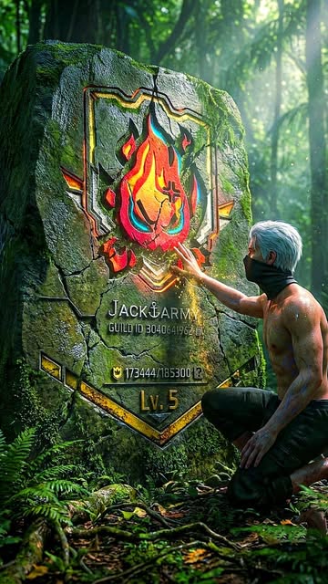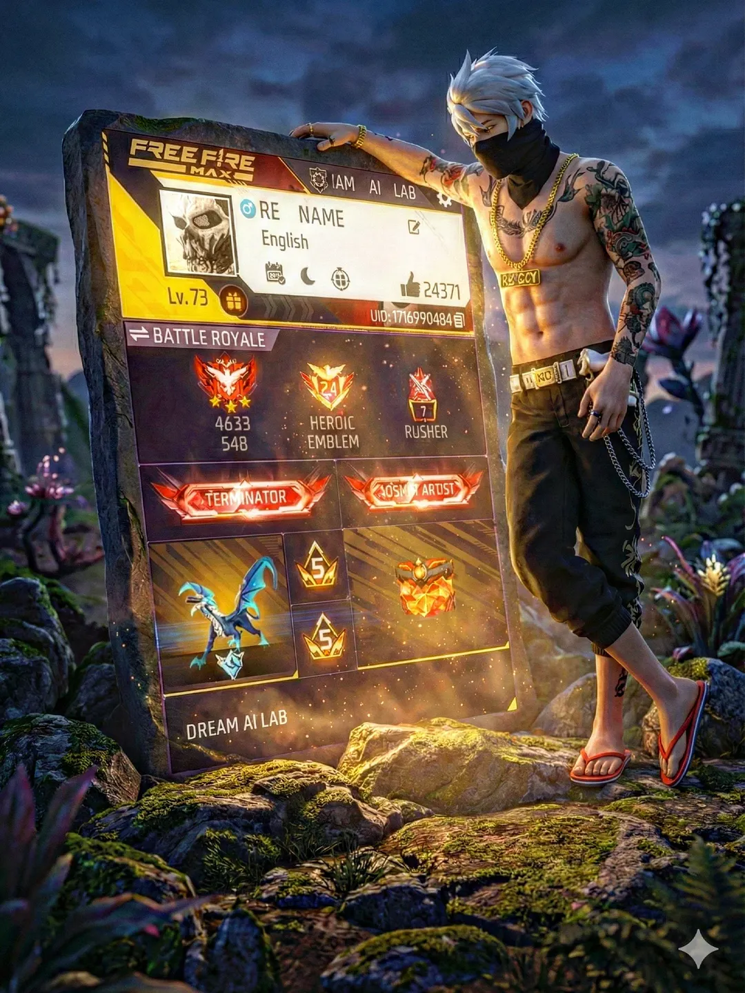 A glant realisme viace samme character from Free Fire Max (uploaded refference is leaning casually against a massive monolithic stone monument. His left arm rests on the top edge of the monument, and his right leg is crossed casually over his left. He is looking down at the glowing screen on the monument. The enormous stone slab is an embedded, illuminated display of a Free Fire Max profile screen(uploaded image), the stome monumen fully covered with big gaming profile.