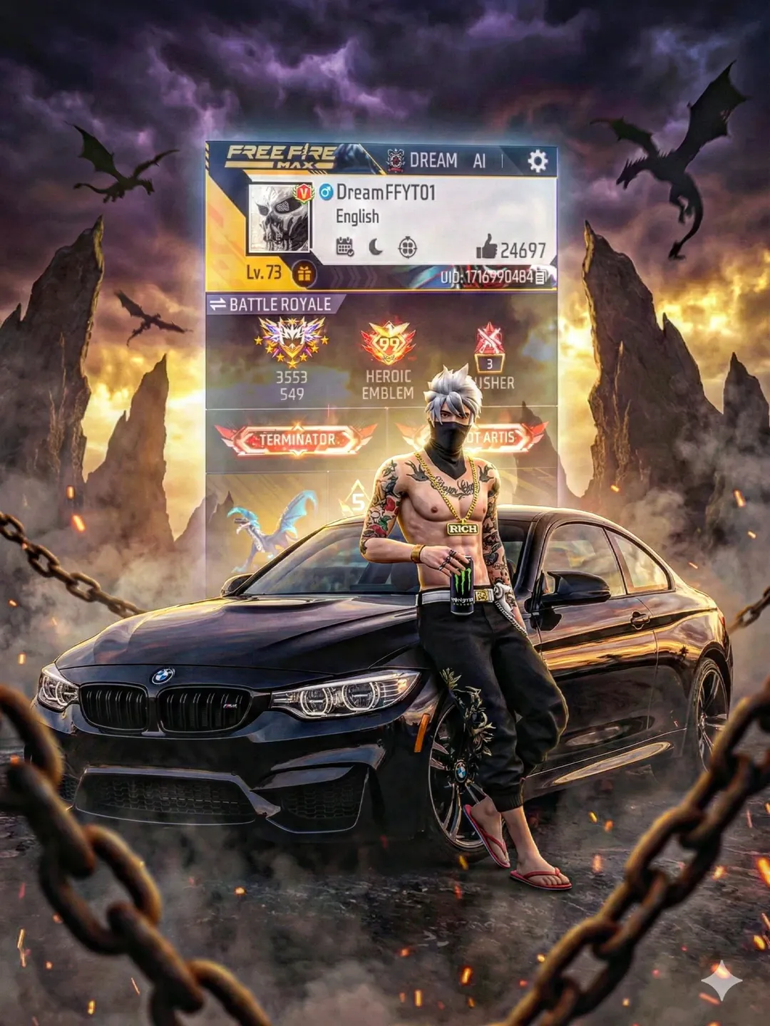 So, if you are also a gaming enthusiast and play Free Fire, you are likely aware that the image displayed here is a composite created by combining several elements. It typically features the player’s favorite character—the one they use during gameplay—along with their in-game ID. This ID showcases their current rank within the active season—such as Heroic, Master, Elite Master, or Grandmaster in CS Ranked mode, or the corresponding tiers in BR Ranked mode. All these details are prominently displayed in this banner-style image, serving as a highlight of their in-game profile and also displaying their player level. The final result looks so impressive—so polished and professional—that it appears as though it was officially created by the gamer’s official fan page. You, too, can create such banner-style images to post on your social media platforms; or, if you are just a casual gamer, you can simply share them as stories to show your friends—and they are sure to be left amazed!