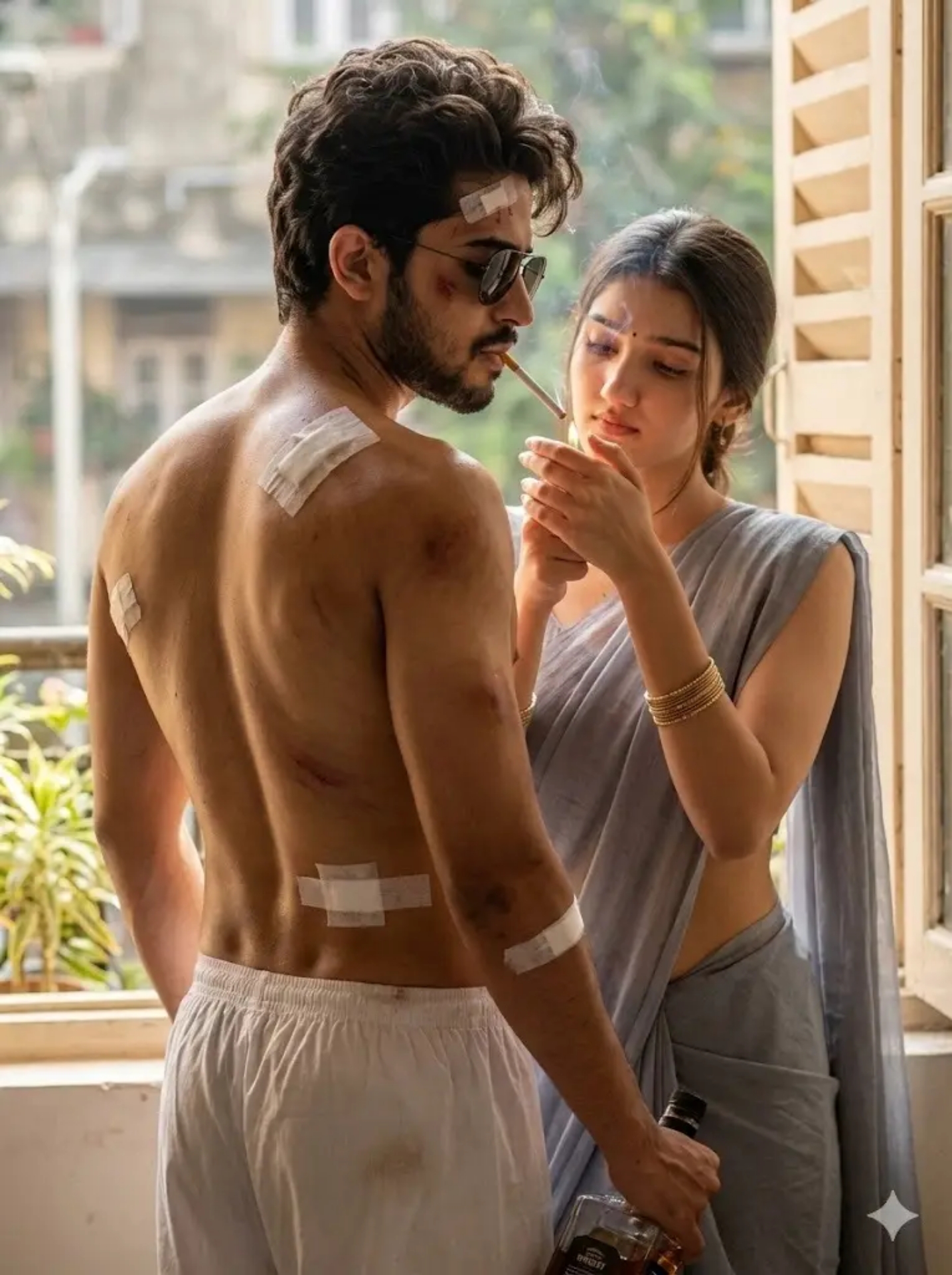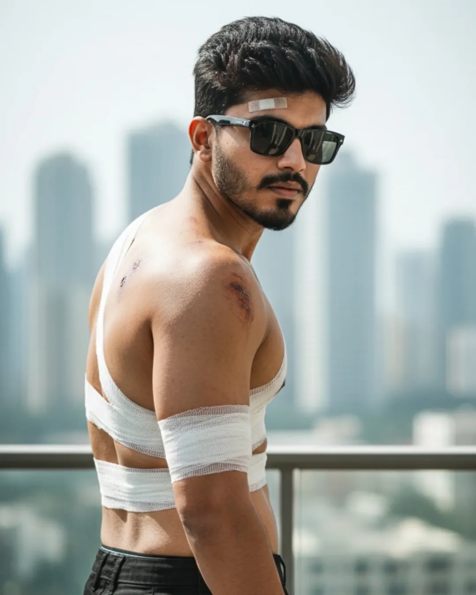 A hyper-realistic, cinematic wide shot from behind of a rugged, muscular man with long dark wavy hair and a beard, standing in a doorway leading to a balcony. He is shirtless, revealing a back covered in bruises and several large white medical bandages taped to his shoulder blades and mid-back. He has a bandage wrapped around his left bicep and his right hand is heavily bandaged, holding a glass of whiskey. He is wearing loose-fitting white linen trousers. He is smoking a cigarette and wearing dark sunglasses, looking slightly in profile. The background shows a blurred city skyline with skyscrapers and potted bamboo plants on the balcony. Natural daylight, gritty action movie aesthetic, 8k resolution, highly detailed skin texture. Aspect ratio 3:4