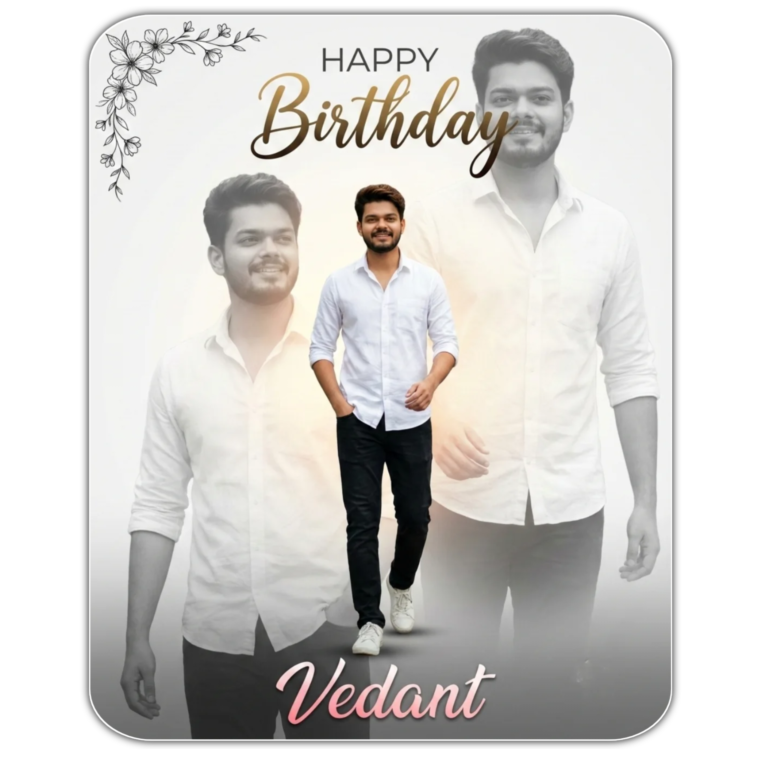 Create an ultra-detailed, professional birthday graphic design in a photo collage style. ratio 4:5, The composition features a me as the central subject, presented in two layers. The primary subject in the lower-right quadrant is a full-color, sharp cutout of the me walking forward one step ahead, one hand in pocket and one hand ahead, he is wearing a stunningly whit shirt and black jeans, white sneakers. The second layer is a much larger, semi-transparent, desaturated black-and-white version of the same me, positioned in the midground, creating a dreamlike echo effect. The overall background is a clean, minimalist white-to-light-grey gradient, with a soft, warm, volumetric glow emanating from the center, behind the subjects. The lighting on the color subject is soft and diffused, as if from an overcast day, creating gentle shadows and emphasizing his happy expression. In the top center, include the text ‘Happy Birthday’; the word ‘HAPPY’ should be in a clean, modern sans-serif font, and ‘Birthday’ in an elegant, flowing script font with a gold-to-dark-brown gradient. In the top-left corner, add a delicate black ink floral vine illustration. At the bottom, place the name ‘Vedant’ in a beautiful, feminine script font with a pink-to-white gradient. Ensure the final image is 8K resolution, with photorealistic skin texture, hyper-detailed fabric physics, and perfect text legibility. Avoid harsh shadows, cluttered backgrounds, distorted text, or unnatural blending between the layers.