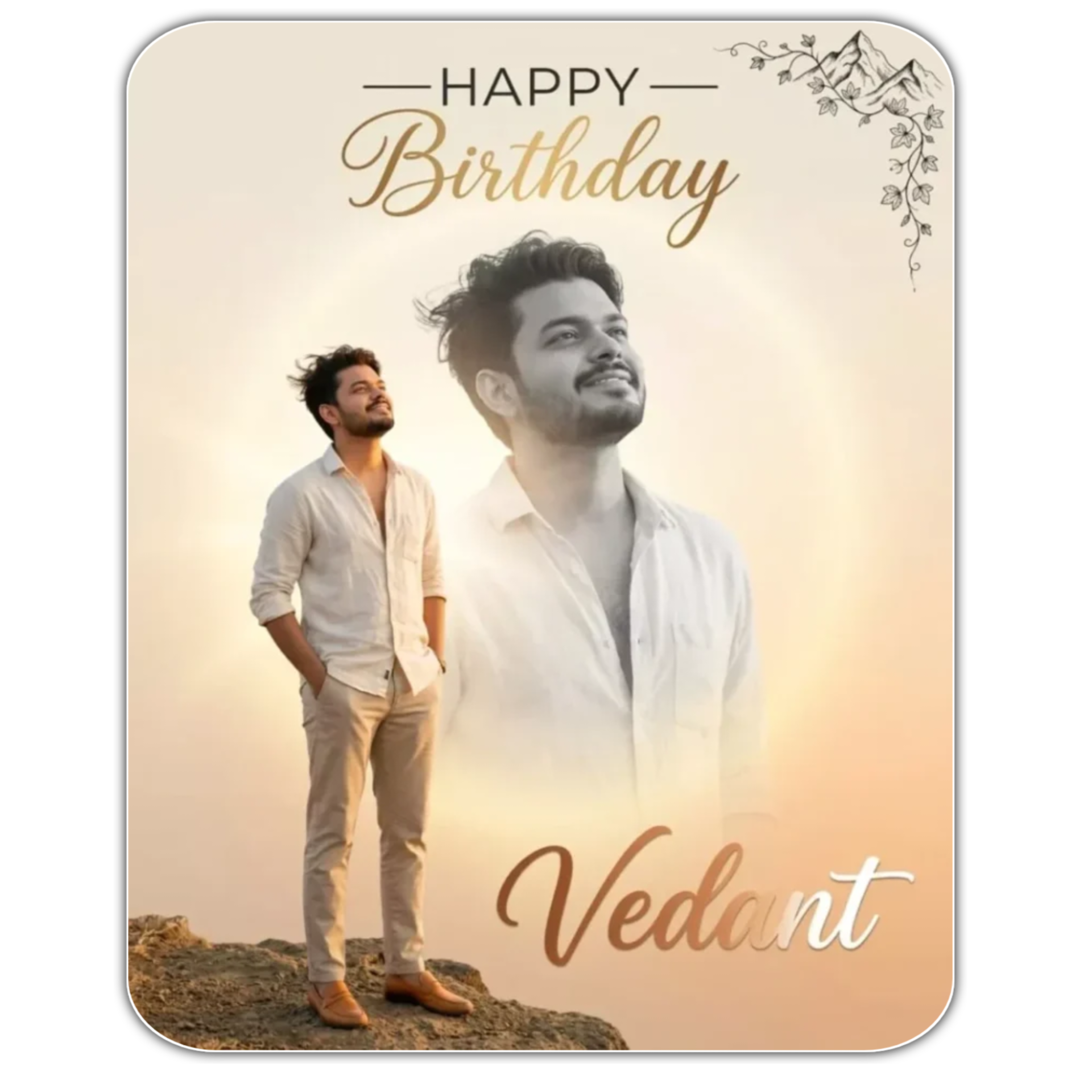Create an ultra-detailed, professional birthday graphic design in a photo collage style. ratio 4:5. The composition features me as the central subject in two layers. The primary subject in the lower-left quadrant is a sharp full-color cutout of me standing on a cliff edge at golden hour, both hands in pockets, head slightly tilted back looking up with a serene, hopeful smile, wearing a cream open linen shirt, beige chinos, tan leather loafers, hair gently windswept. The second layer is a much larger, semi-transparent, desaturated black-and-white version of the same me, positioned behind and above, creating a dreamlike echo effect. The overall background is a clean warm beige-to-soft-orange gradient with subtle sun flare. Soft volumetric golden glow emanating from center behind the subjects. Lighting on color subject is warm golden hour with gentle rim light and long soft shadows. Top center text: ‘Happy Birthday’ — ‘HAPPY’ in clean modern sans-serif, ‘Birthday’ in elegant gold script. Top-right corner: delicate black ink mountain vine illustration. Bottom center: name ‘Vedant’ in warm copper-to-white gradient script. 8K resolution, photorealistic skin texture, hyper-detailed fabric physics, perfect text legibility. Avoid harsh shadows, cluttered backgrounds, distorted text, unnatural blending.
