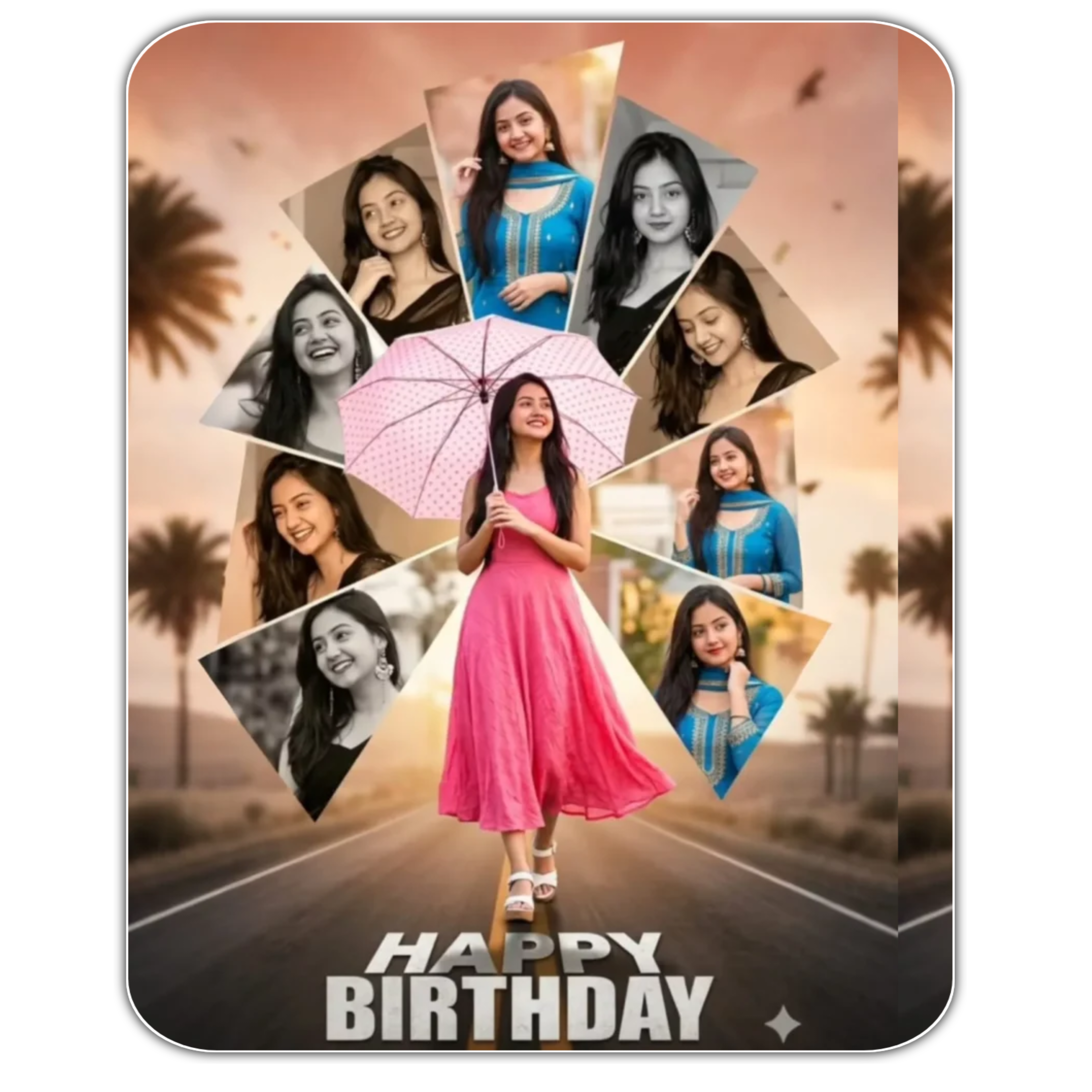A highly detailed and dynamic digital photo collage for a birthday greeting. The overall composition features a central, full-body image with a beautiful young woman with long, dark hair, wearing a flowing pink dress and white platform sandals, holding a light pink polka-dotted umbrella.She is smiling and looking slightly upwards, positioned as if walking down the center of a stylized, slightly blurred asphalt road with faded yellow double lines, leading into the foreground. Surrounding this central figure is an abstract, geometric arrangement of multiple additional images of the same woman, integrated as collage elements. These surrounding images are presented in various angled, trapezoidal, and triangular segments, some in full color (wearing a vibrant blue traditional Indian outfit like a salwar kameez with a dupatta, smiling or posing), and others in black and white or sepia tones (wearing a darker outfit). These segments are layered and overlap subtly, creating a starburst or fragmented glass effect around the central figure. Some of these segments show close-ups or different poses, looking to the side or down. The very top background behind the collage segments is a soft, warm, faded light brown/orange gradient, possibly suggesting a sunset or soft light.In the bottom section of the “road,” large, bold, textured white letters spell out “HAPPY BIRTHDAY,” keeping the same original face (99% likeness, no alteration