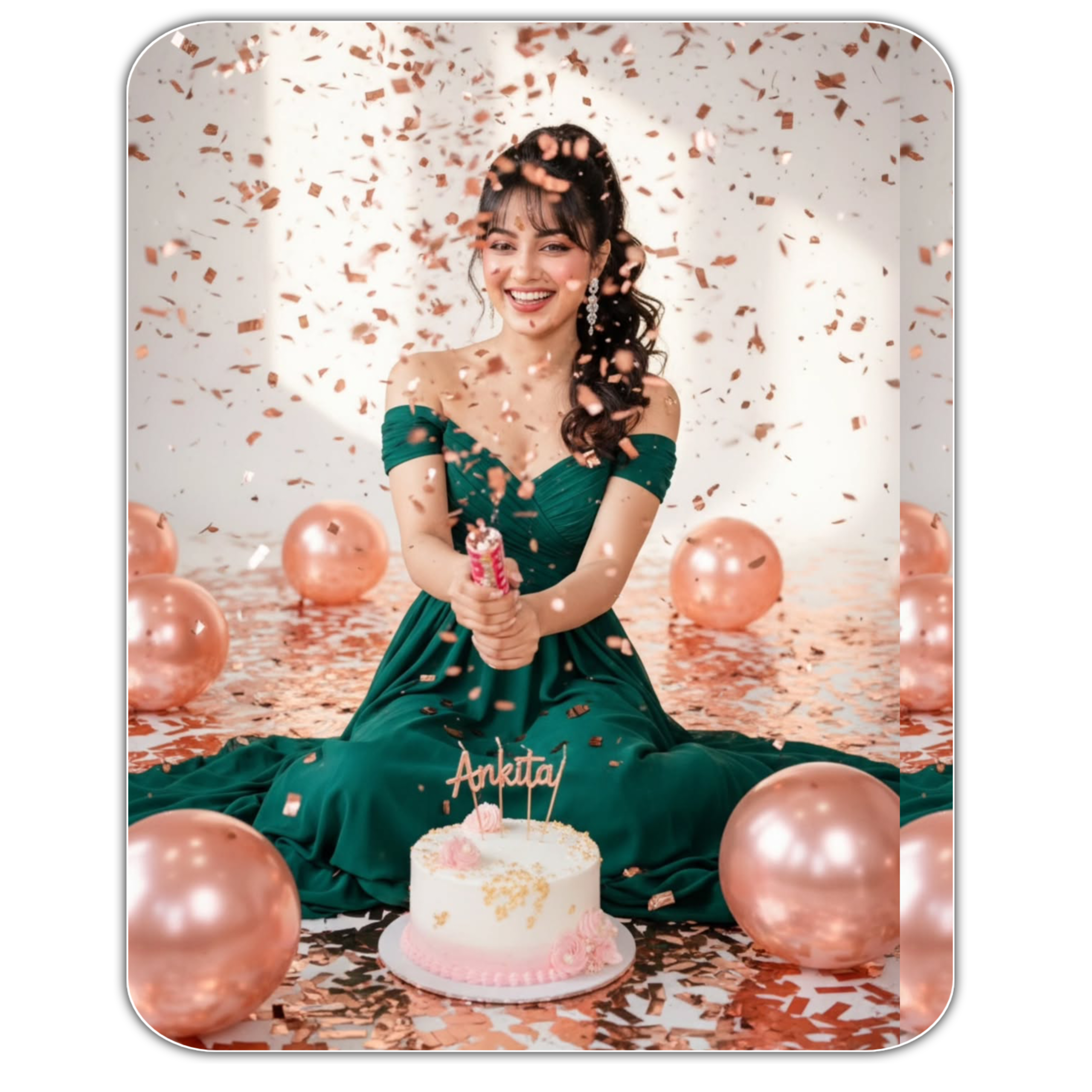 Create ultra-realistic half body portrait, cinematic shot of a girl (given the reference image) without changing my facial features sitting on the floor in a bright stucio space, wearing a flowing deep green dress with off shoulder sleeves. Hairs are tied on high ponytail with side bangs and She is smiling brightly while holding a confetti popper that has just exploded., filling the air with sparkling rose-gold and metallic confetti. Around her are several large shiny rose-gold balloons scattered across the floor, reflecting light. In front of her sits a white birthday cake decorated with pink and gold accents, topped with metallic [name] candles The floor and backgrouind are covered with glittering confett, creating a festive and glamorous atmosphere.100% face unchanged no alteration.