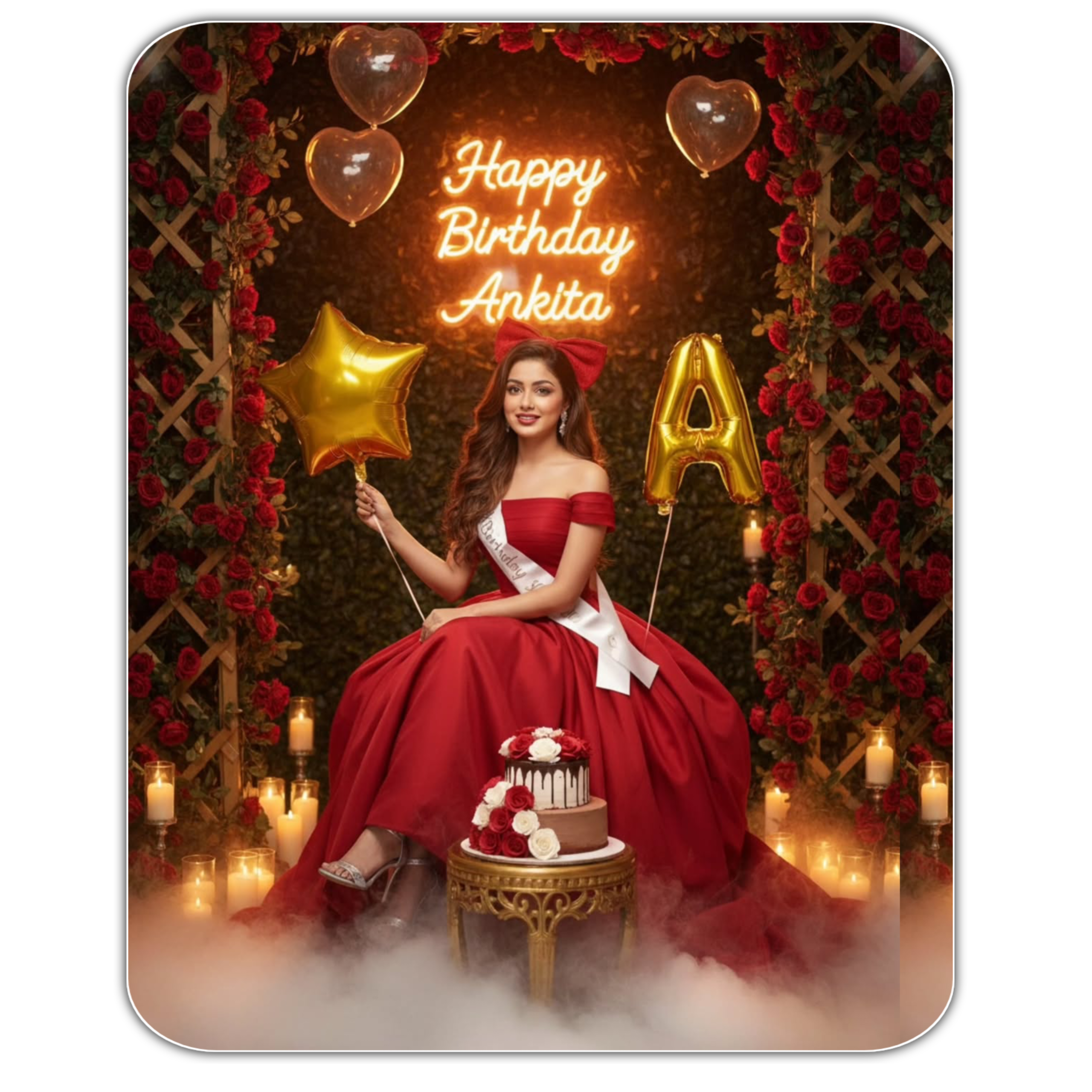 Create an ultra photorealistic cinematic studio portrait of woman(given reference image) with long, wavy brown hair, is seated on a golden, ornate stool, with smile expression. In her left hand she holds a vibrant golden colored star ballon .In her right hand, she holds a string of a vibrant golden colored letter single “A” balloon. A large red bow is tied in her hair. she is wearing a voluminous, off-the-shoulder red voluminous gown paired silver high heels. She is seated on a amidst an abundance of red roses that climb up trellises, creating a lush, romantic garden setting indoors. There are glowing candles scattered among the roses. In front of her is a three