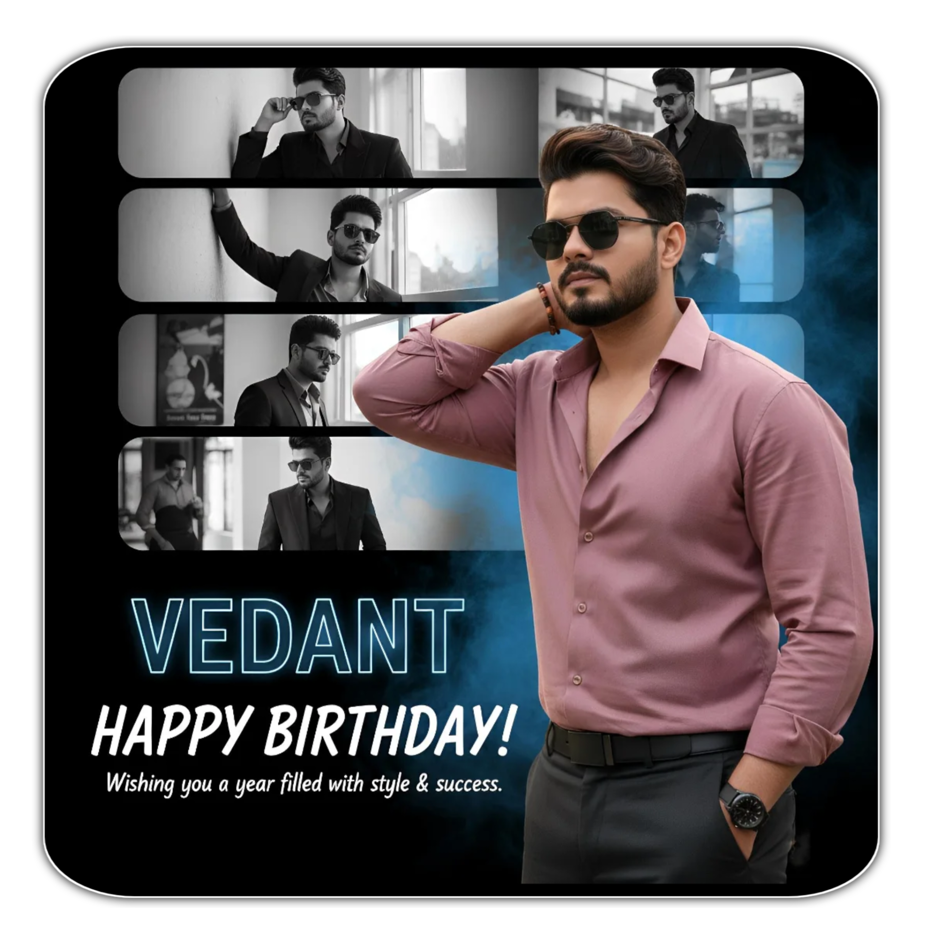 A vertical birthday poster collage design. The background consists of four stacked horizontal rounded rectangles. Inside these panels are black and white cinematic shots of a me with stylish black sunglasses in various poses. Superimposed in the foreground on the left side is a full-color, high-quality cutout of the same me wearing an unbuttoned pink mauve shirt and sunglasses, me standing, one hand behind neck and one in pocket, looking thoughtfully, my name is “VEDANT”, strong right d and blue smoke effect behind me, don’t add numbers, striking a cool pose. The foreground figure has a.