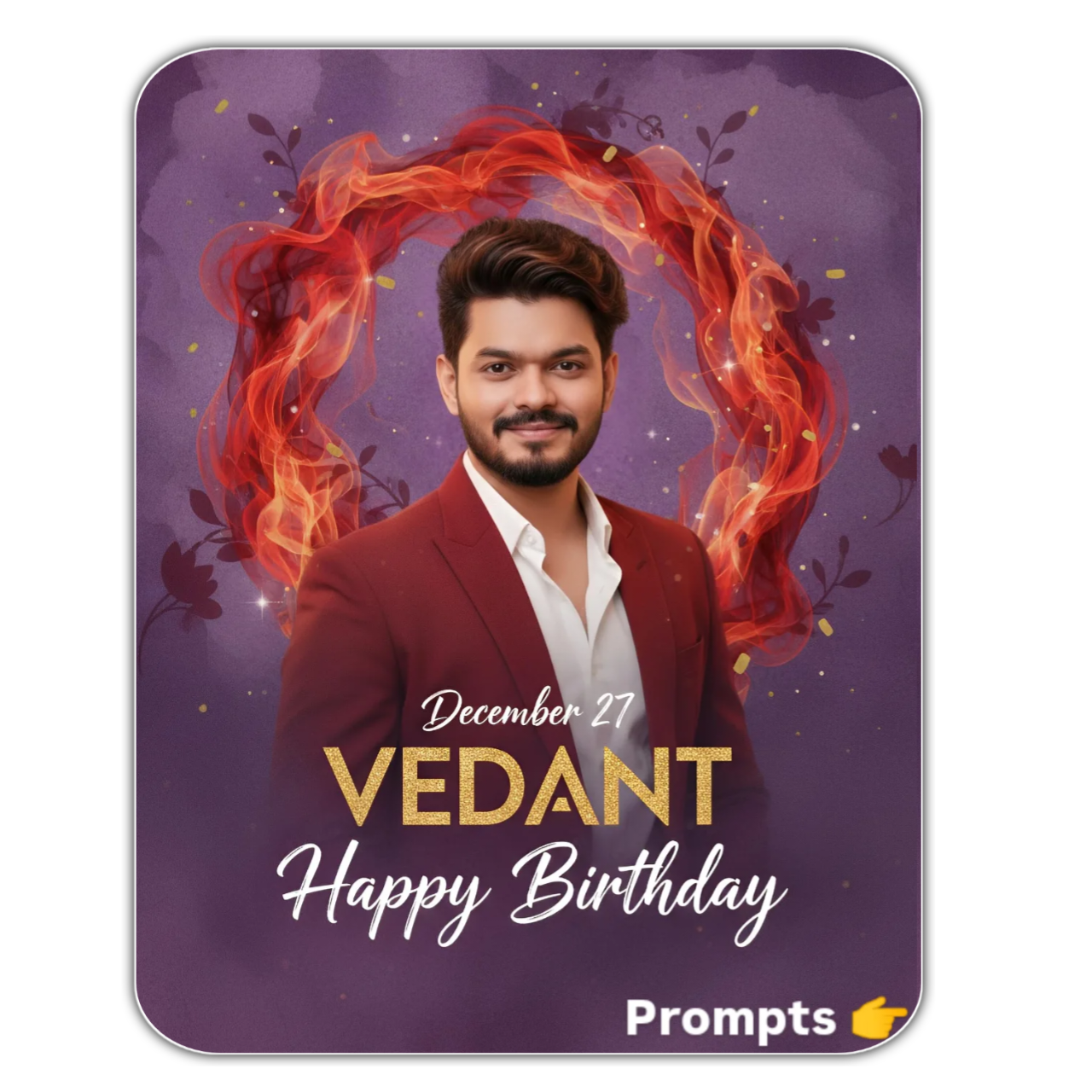 Main Subject: In the foreground, prominently feature a large, soft-focus portrait of a me (same as UPLOADED image), facing to the right with a gentle smile. he is wearing open red stylish blazer and white shirt. He image should blend smoothly into a textured, Add text ” Dec 27th “VEDANT” HAPPY BIRTHDAY ” and purpl83 watercolor-style background, strong red and orange smoke effect behind me.